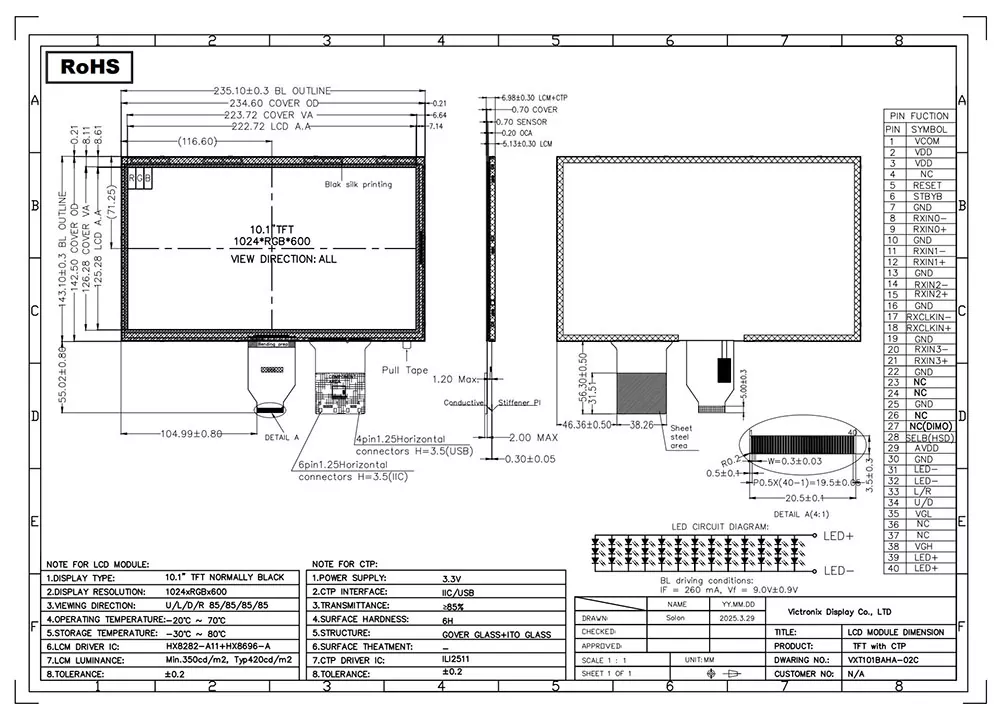 ఇంటెలిజెన్స్ యుగంలో, TFT మాడ్యూల్ అవసరమైన డేటాను దృశ్యమానంగా ప్రదర్శించడానికి మాకు సహాయపడుతుంది. TFT మాడ్యూల్ యొక్క నాణ్యత దాని అనువర్తనంపై క్లిష్టమైన ప్రభావాన్ని చూపుతుంది. CTP తో విక్ట్రోనిక్స్ 10.1 అంగుళాల 1024 × 600 LVDS TFT మాడ్యూల్ యొక్క ప్రయోజనాలు ఏమిటి? మొదట, దాని 420 CD/m² ప్రకాశం, 800: 1 కాంట్రాస్ట్ రేషియో, అన్ని దిశలలో 80-డిగ్రీల వీక్షణ కోణం మరియు 75% ఏకరూపత స్పష్టమైన చిత్రాలను నిర్ధారిస్తాయి. రెండవది, ఇది HX8282A11+HX8696A కంట్రోలర్ మరియు ILI2511 CTP కంట్రోలర్తో బలమైన 5-పాయింట్ కెపాసిటివ్ టచ్ ప్యానెల్తో 6/8-బిట్ LVDS ఇంటర్ఫేస్కు మద్దతు ఇస్తుంది. అదనంగా, ఇది 3 × 13-నేతృత్వంలోని తెల్ల బ్యాక్లైట్ను 30,000 నుండి 50,000 గంటల జీవితకాలంతో కలిగి ఉంది, ఇది వివిధ పారిశ్రామిక అనువర్తనాల్లో దాని దీర్ఘకాలిక వినియోగాన్ని నిర్ధారిస్తుంది. అదనంగా, ఇది ROHS ప్రమాణాలకు అనుగుణంగా ఉంటుంది మరియు థర్మల్ షాక్, తేమ మరియు 8KV గాలి మరియు 4KV పరిచయం వరకు ESD రక్షణతో సహా కఠినమైన విశ్వసనీయత పరీక్షలను విజయవంతంగా దాటుతుంది. ఈ ఉత్పత్తి -20 ° C నుండి +70 ° C వరకు తీవ్రమైన ఉష్ణోగ్రతలలో సమర్థవంతంగా పనిచేస్తుంది మరియు -30 ° C నుండి +80 ° C వరకు తీవ్రమైన నిల్వ పరిస్థితులను తట్టుకోగలదు.