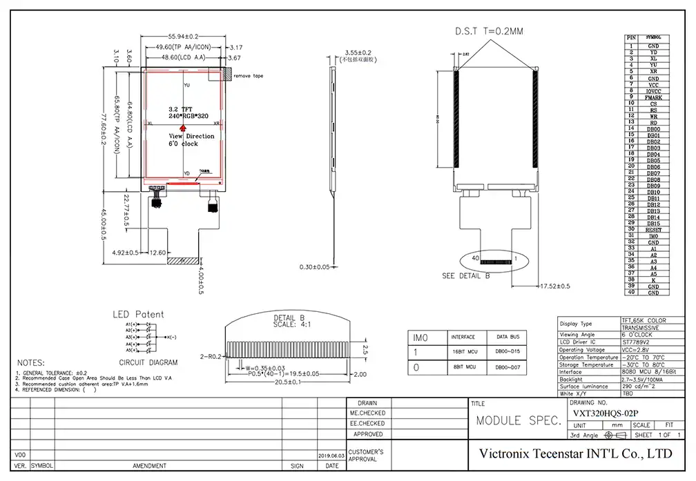 VXT320HQS-02P అనేది 3.2inch, 240x320 పోర్ట్రెయిట్ మోడ్ TFT LCD డిస్ప్లే మాడ్యూల్ రెసిస్టివ్ టచ్ ప్యానెల్ (RTP). ఇది 240x320 చుక్కల రిజల్యూషన్ మరియు 300 CD/NITS (సాధారణ విలువ) యొక్క ప్రకాశాన్ని కలిగి ఉంది, కాంట్రాస్ట్ రేషియో 500: 1 (సాధారణ విలువ). అంతర్నిర్మిత ILI9341 డ్రైవర్ IC తో అమర్చబడి, ఇది 8080 MCU 8-BIT/16-BIT SPI (3-వైర్/4-వైర్) ఇంటర్ఫేస్లకు మద్దతు ఇస్తుంది. మాడ్యూల్ 55.94 మిమీ (డబ్ల్యూ) x 77.60 మిమీ (హెచ్) ను కొలుస్తుంది, క్రియాశీల ప్రాంత పరిమాణం 48.6 x 64.8 మిమీ.