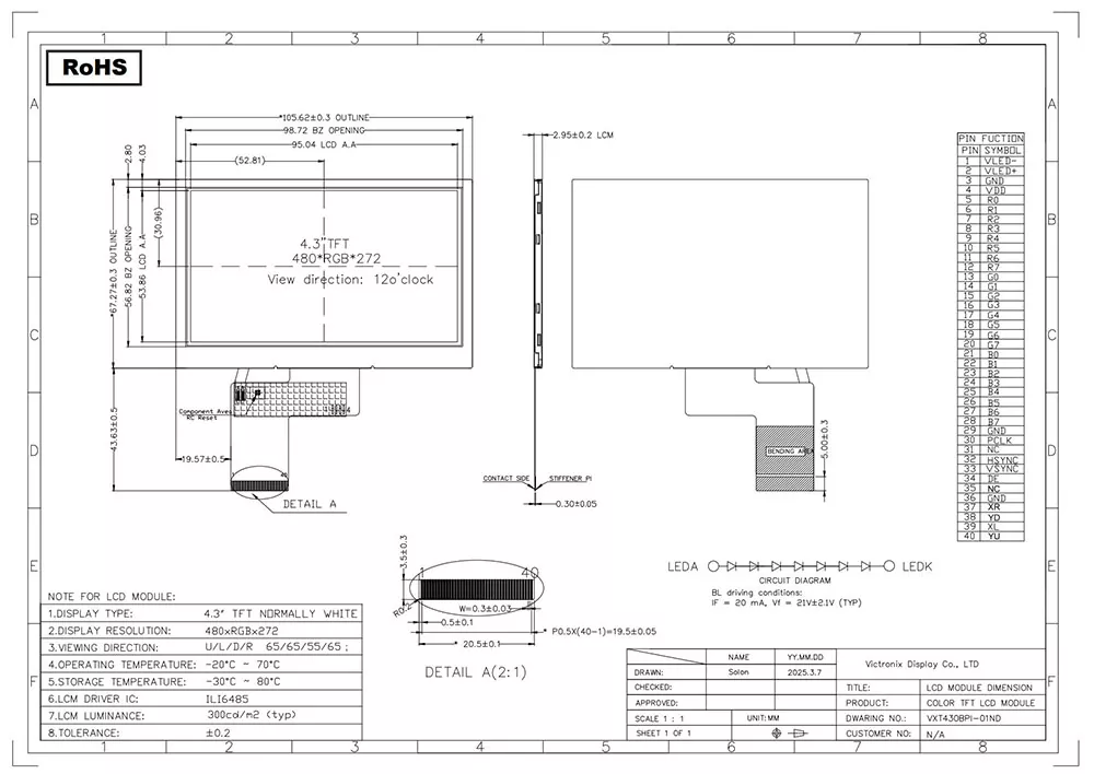 TFT LCD అనేది ఒక రకమైన ద్రవ క్రిస్టల్ డిస్ప్లే, ఇది చిత్ర నాణ్యతను పెంచడానికి సన్నని-ఫిల్మ్ ట్రాన్సిస్టర్ టెక్నాలజీని ఉపయోగించుకుంటుంది మరియు ఇది రోజువారీ జీవితంలో అనేక అనువర్తనాలను కలిగి ఉంది. చైనాలో ప్రొఫెషనల్ టిఎఫ్టి మాడ్యూల్ తయారీదారుగా మరియు సరఫరాదారుగా, విక్ట్రోనిక్స్ 4.3 అంగుళాల 480 × 272 పారిశ్రామిక టిఎఫ్టి మాడ్యూల్ను ఇతర తయారీదారుల నుండి భిన్నంగా చేస్తుంది? మొదట, ఇది 300CD/m² యొక్క విలక్షణమైన ప్రకాశాన్ని, 12 o’clock దిశలో 65 of యొక్క విస్తృత వీక్షణ కోణం మరియు 700: 1 యొక్క కాంట్రాస్ట్ నిష్పత్తిని అందిస్తుంది, ఇది వివిధ కోణాల నుండి అద్భుతమైన చదవడానికి నిర్ధారిస్తుంది. రెండవది, ఇది 7S1P-WHITE LED లను 30,000 నుండి 50,000 గంటల (50% ప్రారంభ ప్రకాశం) తో 7S1P- తెలుపు LED లను ఉపయోగించుకునే బ్యాక్లైట్ యూనిట్ను అనుసంధానిస్తుంది, ఇది అన్ని లైటింగ్ పరిస్థితులలో స్పష్టమైన దృశ్యమానతను నిర్ధారిస్తుంది. అంతేకాకుండా, ఇది ILI6485 నియంత్రికతో RGB ఇంటర్ఫేస్కు మద్దతు ఇస్తుంది. అదనంగా, ఇది థర్మల్ షాక్ (-30 ° C ↔ +80 ° C చక్రాలు), తేమ నిల్వ (60 ° C/90% RH) మరియు యాంత్రిక కంపనంతో సహా కఠినమైన పర్యావరణ పరీక్షలను దాటుతుంది, ఇది విస్తరించిన ఉష్ణోగ్రత పరిధిలో (-20 ° C నుండి +70 ° C) సజావుగా పనిచేయగలదని నిర్ధారిస్తుంది.