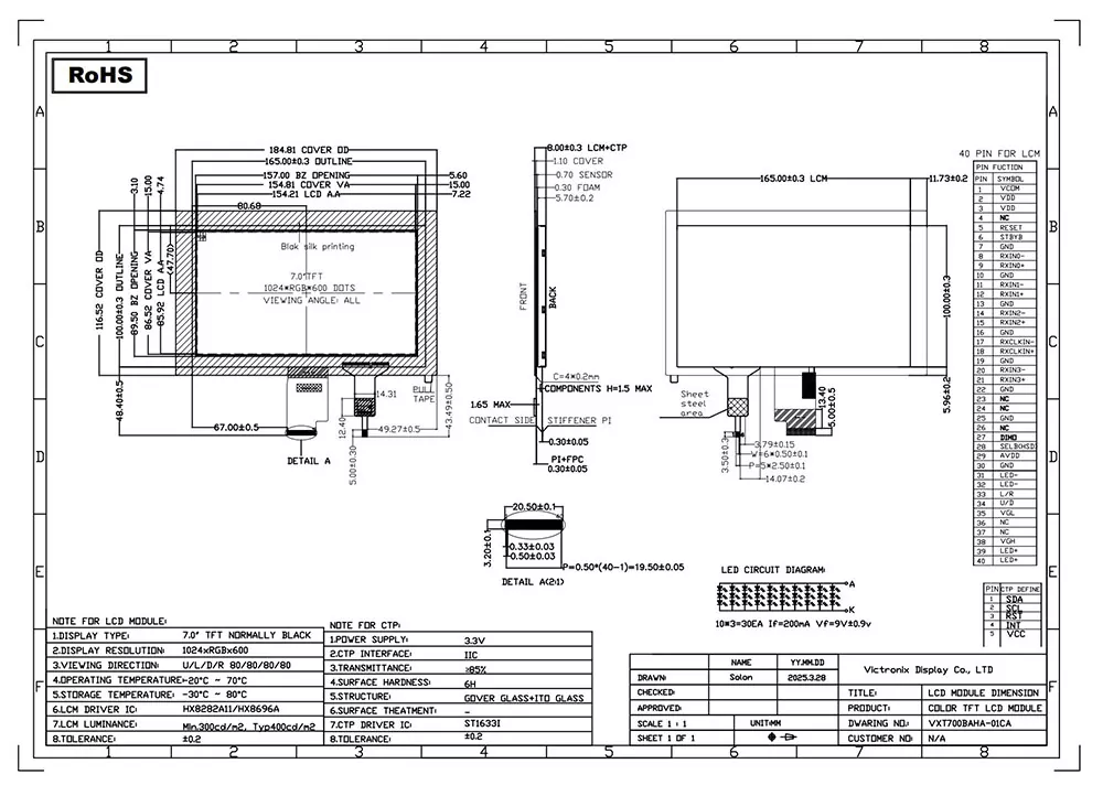 ఇంటెలిజెన్స్ యుగంలో, TFT మాడ్యూల్ అవసరమైన డేటాను దృశ్యమానంగా ప్రదర్శించడానికి మాకు సహాయపడుతుంది. TFT మాడ్యూల్ యొక్క నాణ్యత దాని అనువర్తనంపై క్లిష్టమైన ప్రభావాన్ని చూపుతుంది. విక్ట్రోనిక్స్ 7 అంగుళాల 1024 × 600 ఎల్విడిఎస్ ఐపిఎస్ టిఎఫ్టి ఎల్సిడి యొక్క ప్రయోజనాలు ఏమిటి? మొదట, దాని 420 CD/m² ప్రకాశం, 800: 1 కాంట్రాస్ట్ రేషియో, అన్ని దిశలలో 80-డిగ్రీల వీక్షణ కోణం మరియు 75% ఏకరూపత స్పష్టమైన చిత్రాలను నిర్ధారిస్తాయి. రెండవది, ఇది HX8282A11/HX8696A కంట్రోలర్, కెపాసిటివ్ టచ్ ప్యానెల్ ST1633I కంట్రోలర్ మరియు 3 × 10 వైట్ LED బ్యాక్లైట్తో 30,000 నుండి 50,000 గంటల జీవితకాలం, వివిధ పారిశ్రామిక అనువర్తనాల్లో దాని దీర్ఘకాలిక వినియోగాన్ని నిర్ధారిస్తుంది. అంతేకాకుండా, ఇది ROHS ప్రమాణాలకు అనుగుణంగా ఉంటుంది మరియు థర్మల్ షాక్, తేమ మరియు 8KV గాలి మరియు 4KV కాంటాక్ట్ వరకు ESD రక్షణతో సహా కఠినమైన విశ్వసనీయత పరీక్షలను విజయవంతంగా దాటుతుంది. ఈ ఉత్పత్తి -20 ° C నుండి +70 ° C వరకు తీవ్రమైన ఉష్ణోగ్రతలలో సమర్థవంతంగా పనిచేస్తుంది.
