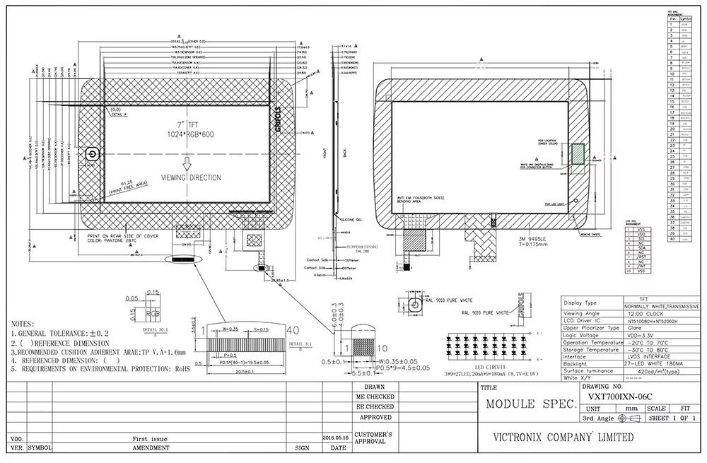 ఇంటెలిజెన్స్ యుగంలో, TFT మాడ్యూల్ అవసరమైన డేటాను దృశ్యమానంగా ప్రదర్శించడానికి మాకు సహాయపడుతుంది. TFT మాడ్యూల్ యొక్క నాణ్యత దాని అనువర్తనంపై క్లిష్టమైన ప్రభావాన్ని చూపుతుంది. విక్ట్రోనిక్స్ 7 అంగుళాల 1024 × 600 సాధారణంగా వైట్ టిఎఫ్టి ఎల్సిడి మాడ్యూల్ యొక్క ప్రయోజనాలు ఏమిటి? మొదట, ఇది స్పష్టమైన, ఖచ్చితమైన విజువల్స్ కోసం 12 o’clock వద్ద ఉత్తమ వీక్షణ కోణంతో 420 CD/m² అధిక ప్రకాశాన్ని ఉపయోగిస్తుంది. రెండవది, ఇది NT5100BCH+NT52002H డ్రైవర్ IC తో LVDS ఇంటర్ఫేస్కు మద్దతు ఇస్తుంది మరియు 27 నేతృత్వంలోని బ్యాక్లైట్ జీవితకాలంతో 50,000 గంటలు, వివిధ పారిశ్రామిక అనువర్తనాల్లో దాని దీర్ఘకాలిక వినియోగాన్ని నిర్ధారిస్తుంది. అంతేకాకుండా, ఇది ROHS ప్రమాణాలకు అనుగుణంగా ఉంటుంది మరియు థర్మల్ షాక్, తేమ మరియు 8KV గాలి మరియు 4KV కాంటాక్ట్ వరకు ESD రక్షణతో సహా కఠినమైన విశ్వసనీయత పరీక్షలను విజయవంతంగా దాటుతుంది. ఈ ఉత్పత్తి -20 ° C నుండి +70 ° C వరకు తీవ్రమైన ఉష్ణోగ్రతలలో సమర్థవంతంగా పనిచేస్తుంది.
